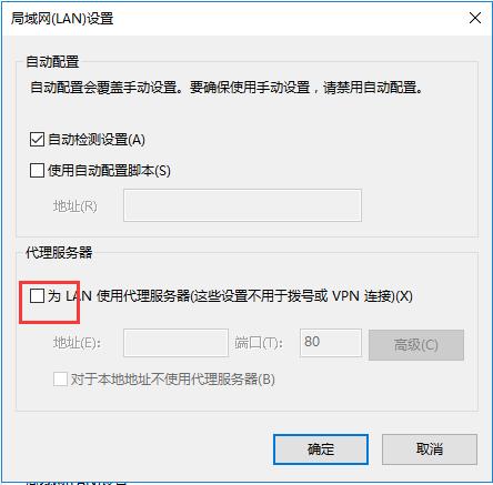 3、在弹出的“局域网LAN设置”中,勾去“为LAN使用代理服务器”,点击确定,即可解决问题了。